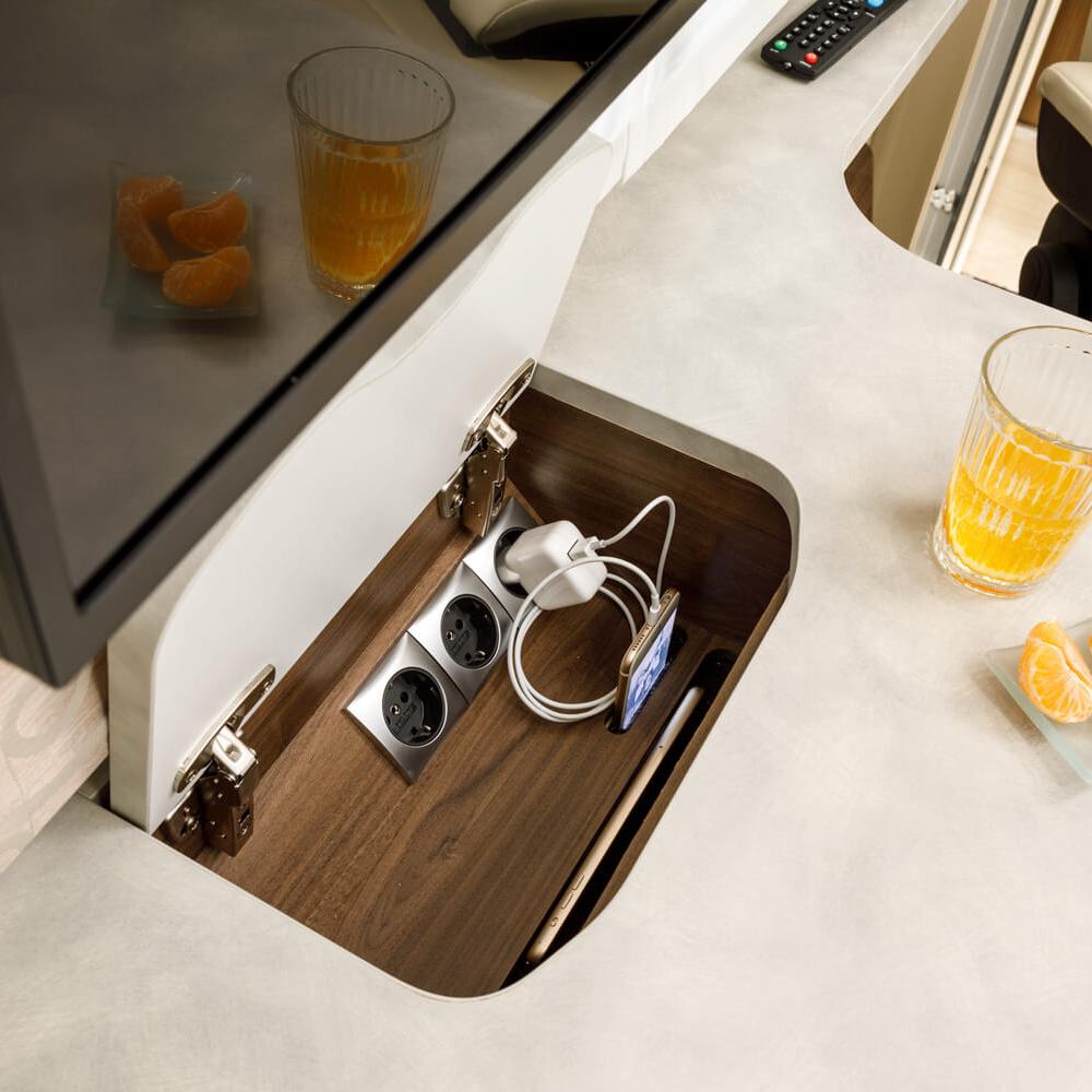- Le groupe de sièges de bar peut être utilisé pour manger et se détendre mais aussi se transformer de façon idéale en bureau ou en espace multimédia : compartiment intégré et spacieux avec ses trois prises de courant et ses dispositifs de fixation offre de l’espace et des possibilités de connexion pour un smartphone, un ordinateur portable et d’autres appareils.